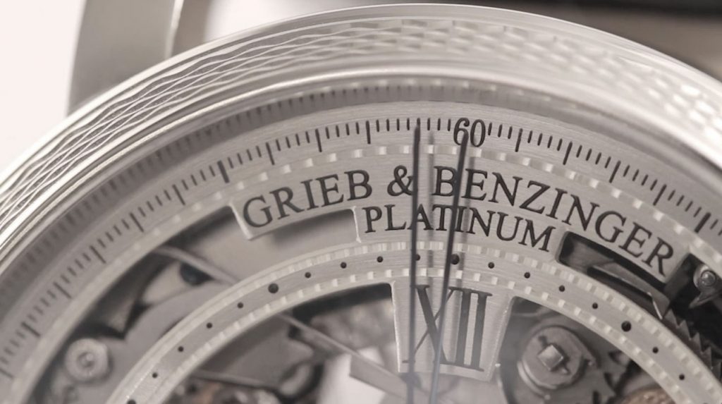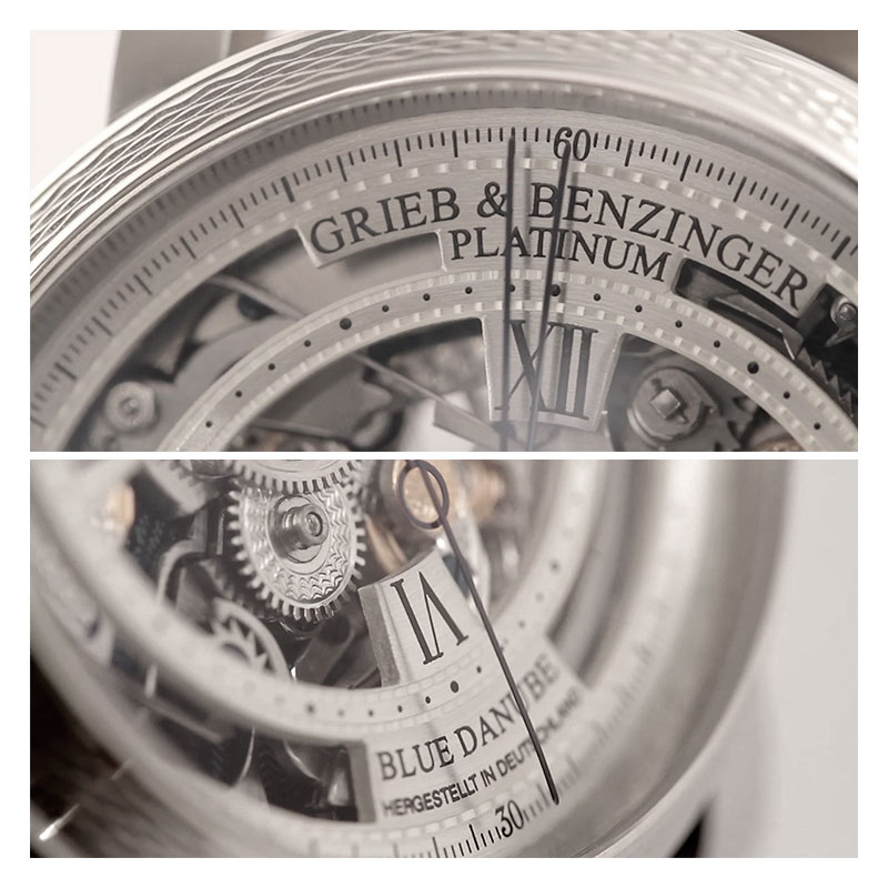 All base plates of the Platinum movements are coated with blue platinum in homage to the grand tradition of Charles Oudin, one of Breguet’s pupils. In this way the unmistakable character of Grieb & Benzinger’s Platinum watches are ensured. The combination of precious platinum and the platinum blue-coated movements creates a harmonious, cool contrast, which makes our uniquely decorated watches so unmistakably recognizable. Grieb & Benzinger is worldwide the only brand using blue platinum to decorate watch movements.